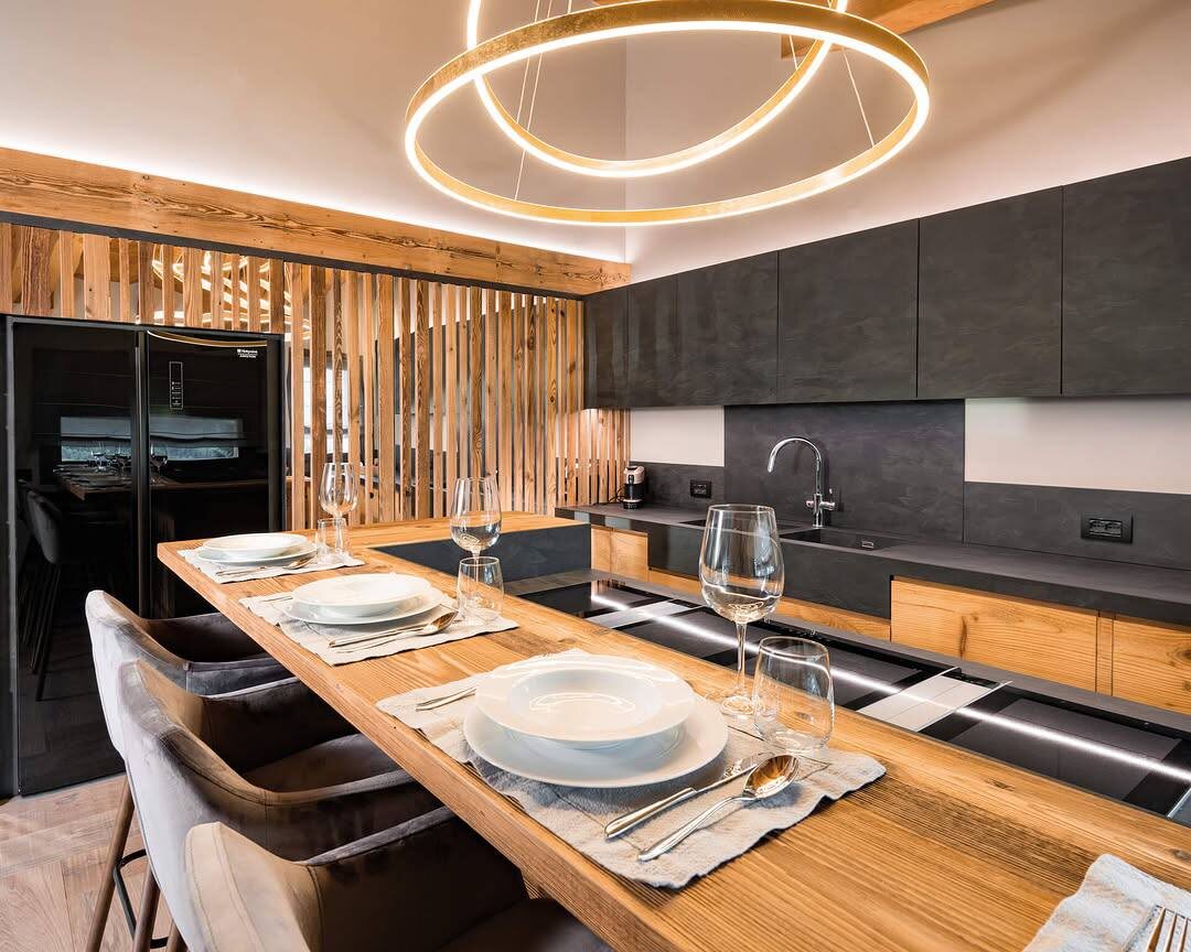 Дерево — это не просто строительный материал. Это символ гармонии с природой, который приносит в наш дом элементы уюта и тепла. Деревянные конструкции обладают отличными теплоизоляционными свойствами, способствуют созданию здорового микроклимата и помогают нам чувствовать себя ближе к природе. Кухня: контраст между чистыми линиями и натуральными материалами создает уютную и изысканную обстановку. Дизайнерские люстры, подвешенные над столом, добавляют нотку элегантности, а скрытое освещение подчеркивает текстуру дерева. Лестница: произведение искусства, которое легко соединяет жилую зону со спальнями. Деревянные ступени, подвешенные на прозрачном стеклянном каркасе, придают пространствам ощущение легкости и непрерывности. Гостиная: атмосфера, которая расслабляет, благодаря теплу камина и мягкости текстур. Древесина сама по себе является прекрасным декоративным материалом. Современные тенденции все чаще ставят акцент на сохранение естественной текстуры дерева, что подчеркивает его природ