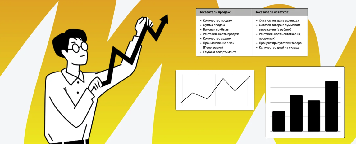 Эти показатели помогают получить полную картину по ассортименту как всей сети, так и отдельной точки или товарной категории.