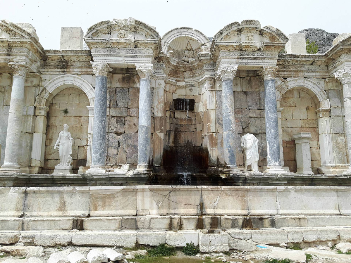 Центральной доминантой городского ансамбля является монументальный нимфей (фонтан) — одно из самых впечатляющих сооружений такого типа во всей Малой Азии. Построенный в середине II века н.э., этот величественный фонтан имел высоту 9 метров и протяженность 28 метров. Его фасад был богато украшен статуями римских божеств и аллегорических фигур. Особую ценность представляют скульптуры, найденные археологами на дне бассейна фонтана. По мнению исследователей, они были намеренно сброшены туда раннехристианскими жителями города, стремившимися искоренить языческие культы. Благодаря этому обстоятельству скульптуры прекрасно сохранились и сегодня представлены в музее города Бурдур, в то время как на оригинальных местах установлены точные копии.