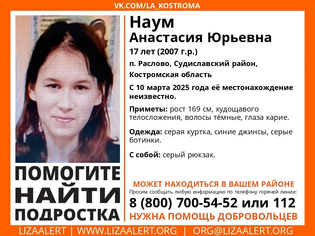 О местонахождении 17-летней Анастасии ничего неизвестно с 10 марта В Костромской области пропала 17-летняя девочка. Помощи в ее поисках просят добровольцы отряда «ЛизаАлерт» по региону в официальной группе ВКонтакте. По информации отряда, Наум Анастасия Юрьевна пропала 10 марта из поселка Раслово Судиславского района. Особые приметы: рост 169 сантиметров, худощавое телосложение, темные волосы и карие глаза. Девочка была одета в серую куртку, синие джинсы и серые ботинки. При себе у подростка был серый рюкзак. Информацию о местонахождении девочки можно сообщить по номеру горячей линии 8(800)700 54-52 или 112.