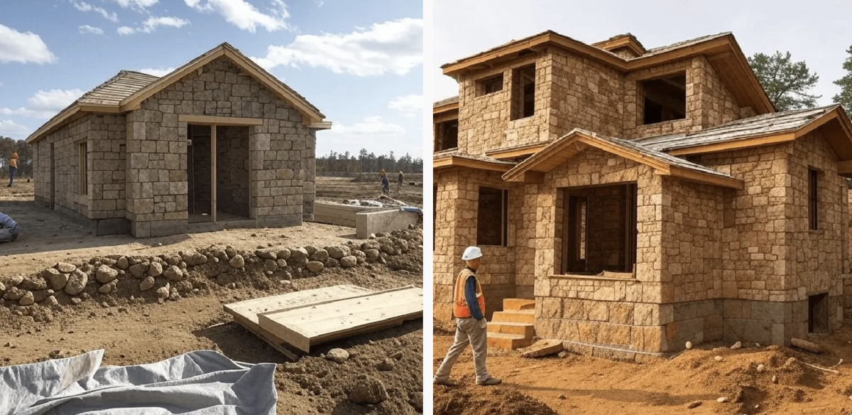 Дом из природного камня способен простоять века, не теряя своей прочности и эстетической привлекательности. Материал устойчив к внешним воздействиям, не боится резких перепадов температур, влажности и механических нагрузок. Природный камень — это натуральный материал, не содержащий вредных примесей и не выделяющий токсичных веществ. В таком доме создается благоприятный микроклимат, обеспечивающий комфортное проживание в любое время года. Каждый камень уникален по цвету, текстуре и форме. Дом из природного камня выглядит благородно и солидно, гармонично вписывается в окружающий ландшафт и может быть выполнен в любом архитектурном стиле — от классики до модерна. Перед началом строительства важно определить тип камня. Для возведения несущих стен чаще всего используют: Из-за высокой массы дома из природного камня фундамент должен быть надежным и прочным. Оптимальные варианты — ленточный или монолитный фундамент, обеспечивающий равномерное распределение нагрузки. Камень укладывается с испо