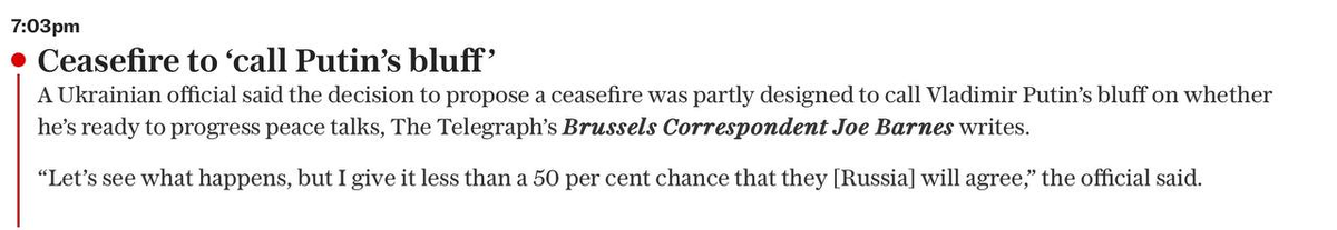 Пока, к сожалению, это выглядит именно так. Вчера делегация Украины на переговорах одержала победу. Либо они подвели США к 30-ти дням перемирия, либо это сделал Трамп, но факт остается фактом и теперь у России остаются считанные часы на ответ. Это тупик не иначе До этого, напомню, Путин говорил о том, что прекращения огня (временного) быть не может. Иначе мы или получим ситуацию 22 года со Стамбулом или длительный Минск 3 который потом перерастет в третью мировую без сомнений Но и не согласиться для нас это проблема!!! Все что говорил Путин ранее это одно, то что происходит теперь при участии США это другое. То, что прекращение огня для нас это катастрофа так как Украину за 30 дней так вооружат и подготовят что мама не горюй, а нам эта передышка не нужна совсем! Тем временем Украина, которая очень хорошо (в отличие от нас) работает со СМИ и общественной повесткой уже разгоняет инфу, что сейчас всему миру покажут блеф Путина с его желанием к миру. Мы - побеждаем. Для нас остановиться