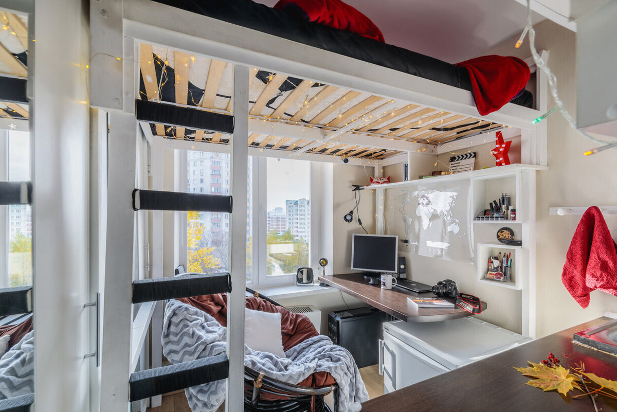 За коридором начинается основное жилое пространство квартиры. С правой стороны — мини-кухня. По центру — двухэтажная конструкция из рабочего места снизу и большой двуспальной кровати сверху. Обычно такие «лофтовые» конструкции стоят около 200 000 рублей — сравнимо с полным бюджетом на ремонт в моем случае. Поэтому «второй этаж» мне помог сделать друг, из нескольких прочных балок. По левую сторону расположен шкаф, на дверце которого есть зеркало — это помогает визуально увеличить пространство.