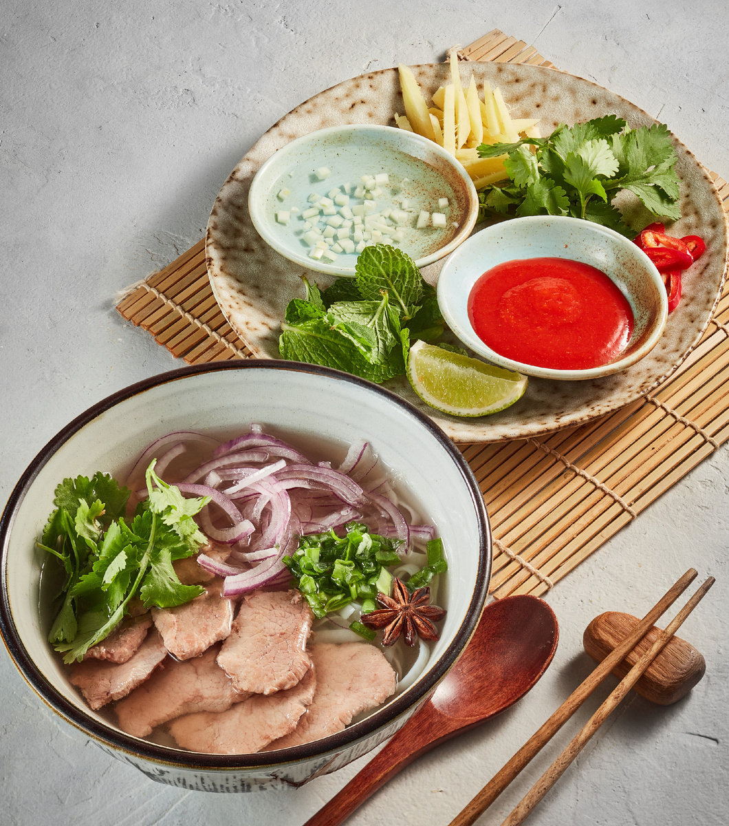 Суп Фо бо— это традиционное вьетнамское блюдо, представляющее собой ароматный бульон с рисовой лапшой, мясом (чаще всего говядиной или курицей) и разнообразными травами и специями. Это блюдо стало популярным во всем мире благодаря своему уникальному вкусу и аромату. Вот подробный рецепт приготовления супа Фо, который можно адаптировать для ресторана. Ингредиенты: Для бульона: Говяжьи кости — 1-1,5 кг (можно использовать говяжью грудинку или другие части) Лук репчатый — 1-2 шт. (разрезанный пополам) Имбирь — 1-2 см (разрезанный пополам) Специи: Звездчатый анис — 2-3 шт. Корица — 1 палочка Гвоздика — 2-3 шт. Черный перец — 5-6 горошин Соль — по вкусу Сахар — 1-2 ст. ложки (по желанию) Вода — 3-4 литра Для подачи: Рисовая лапша — 300-400 г (фо) Мясо: Говядина (тонко нарезанная) — 200-300 г Можно добавить курицу или другие виды мяса по желанию. Свежие травы: Базилик (вьетнамский или обычный) Мята Кинза Зеленый лук (нарезанный) Лайм — 1-2 шт. (нарезанный дольками) Чили — по желанию (нарезан