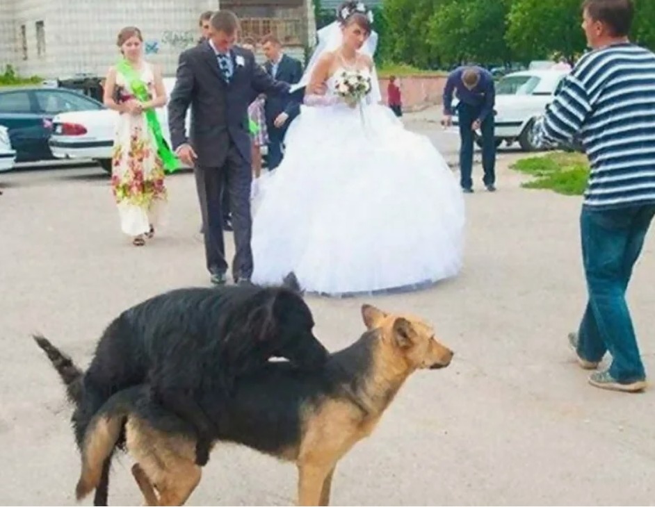 А потом, когда фотку распечатали, стало видно, что сзади, ровно между молодожёнами, на заднем фоне собака делает своё грязное дело.