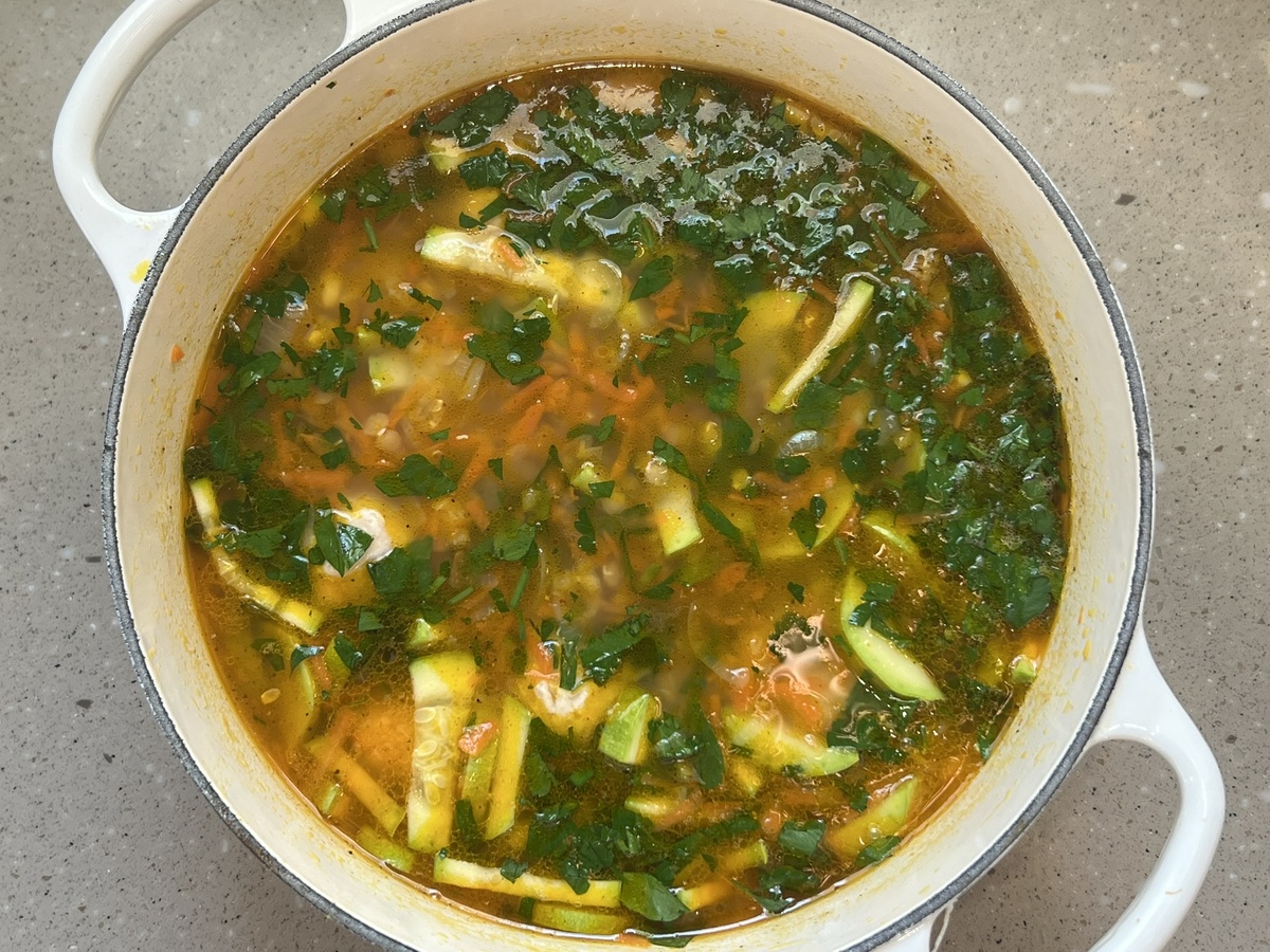 Фрикадельки – 300 гр. Масло раст. - 2 ст.л Лук репчатый – 1 шт. (100 г) Морковь – 1 шт. (100 г) Кабачок– 150 г Кукуруза консервировання – 70 г Чечевица красная – 70 г Паприка – 1 ч.л Кардамон – 1 ч.л Петрушка – 5 веточек Соль, перец Лук режем соломкой, морковь трем на крупной терке, кабачок режем небольшими брусочками. Нагреваем масло в кастрюле (у меня чугунная кастрюля, поэтому я сразу всё обжариваю в кастрюле, если ваша кастрюля не пригодна к жарке, то зажарку делайте отдельно на сковороде). На среднем огне обжариваем лук и морковь примерно 3 минуты. Вливаем литр воды или куриного бульона, если бульон не солёный, то солим. Добавляем промытую чечевицу. Доводим до кипения на высоком огне, а затем уменьшаем его до слабого кипения и варим 10 минут. Затем отправляем в кастрюлю фрикадельки, кабачок и кукурузу, и еще варим на небольшом огне минут 10. В конце добавляем специи, пробуем и при необходимости солим еще. Выключаем огонь и даем супу постоять под крышкой минут 5. Подаем со свежей