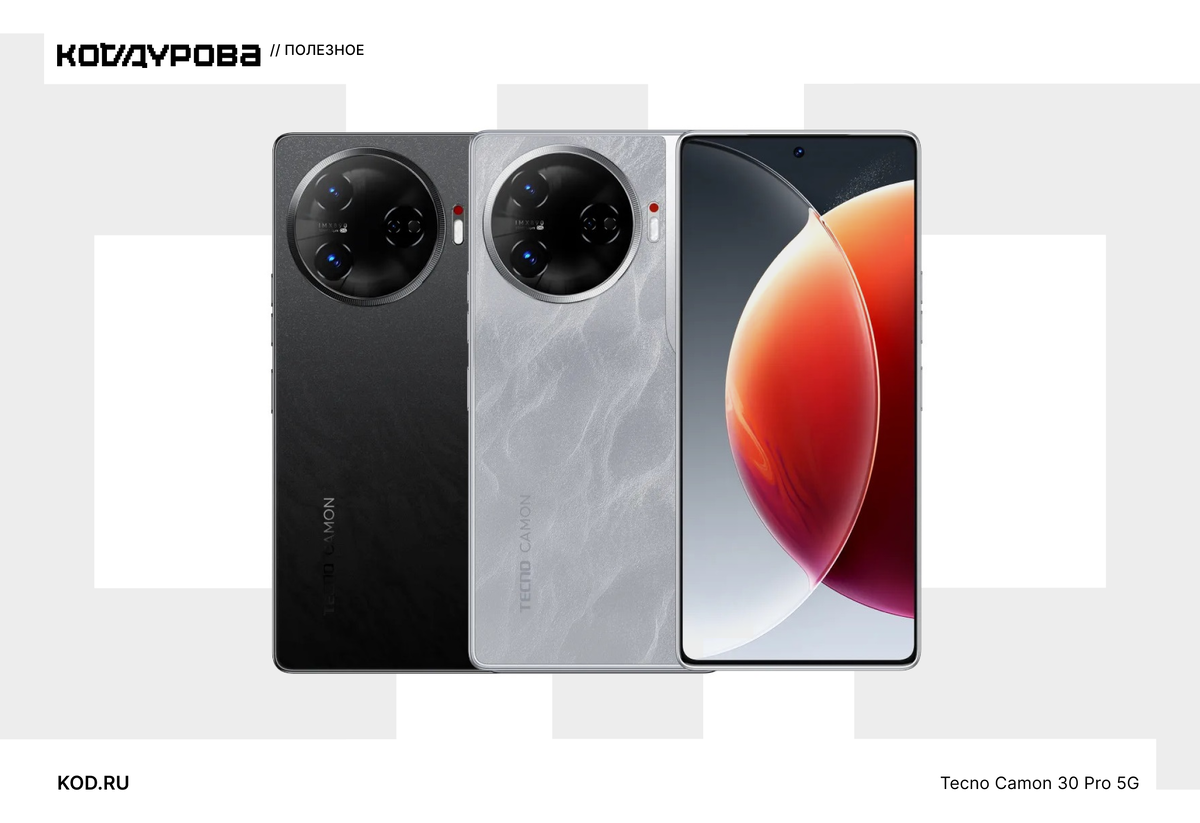 Подборку открывает модель от Tecno — Camon 30 Pro 5G. Устройство примечательно возможностью съёмки видео в 4K при 60 кадрах в секунду.