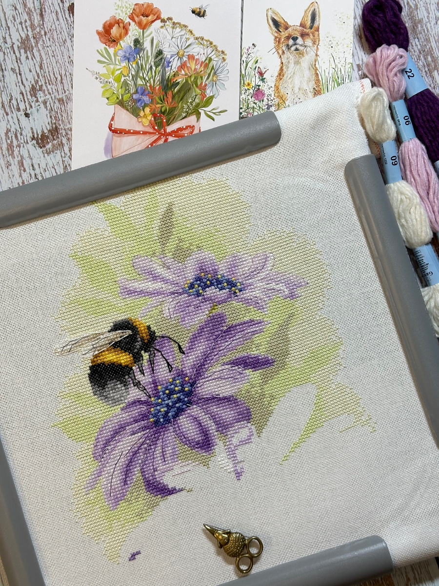 56.5% \(^▽^)/ Большая часть крестиков позади (ง ื▿ ื)ว Большая часть бэкстича позади (но его, к слову, совсем немного в этом сюжете) ( ˙꒳˙ ) Буду передвигать снапы ниже и работать по такому же принципу: вышить весь оставшийся фон, а самое интересное оставить на сладкое 🐝💜 «Dancing Bees» от Lanarte