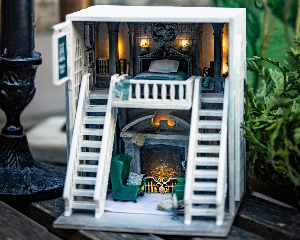 Как жил Драко в поместье Малфоев, роскошном особняке чистокровных волшебников? Давайте представим вместе. На первом этаже симметрично расставьте кресла у старинного камина с узорчатой решеткой. В боковой нише спрячьте проход в подземелье. Кто знает, какие тайны он хранит веками. На втором этаже разместите древние фолианты в нишах, застелите кровать бархатным покрывалом и оставьте рядом с подсвечником серебряный артефакт Йорика. Украсьте стену портретами, а с эмблемы над кроватью пусть поблескивают зелёными глазами коварные змейки. А когда закончите собирать комнату, поднесите её окном к солнечному свету, чтобы он заиграл в большом витраже. В наборе уже есть нужные материалы и инструменты: деревянные детали, краски, кисти, наждачная бумага, клей, 3д-детали, канцелярский нож, принты, текстиль. Румбокс светится. Светодиодная гирлянда с батарейкой входит в набор. Заказать ВКонтакте Заказать на Ozon Заказать на Wildberries