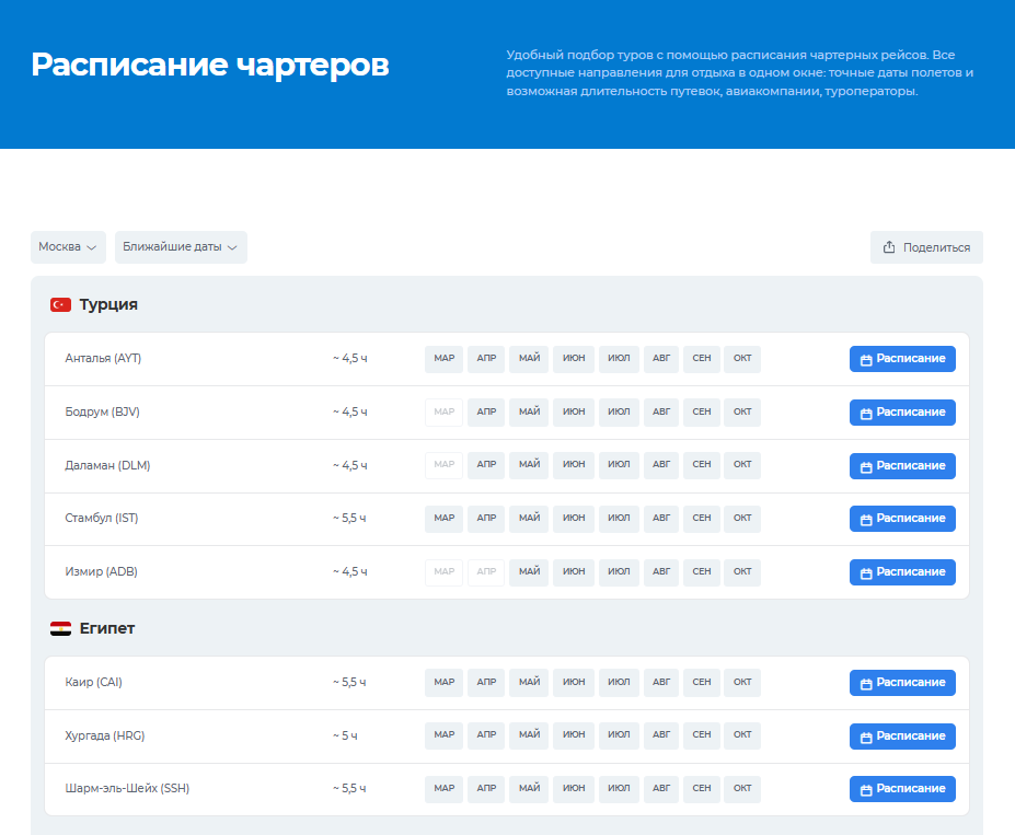 Мы рады представить вам новый сервис «Расписание чартерных рейсов» от Турвизора, который сделает процесс поиска и бронирования туров проще и удобнее. Теперь вся необходимая информация для планирования вашего отпуска — расписание рейсов, авиакомпании, туроператоры и длительность путевок — собрана в одном месте. С нашим новым сервисом вам больше не нужно тратить время на переключение между вкладками или поиски информации о доступных направлениях. Просто выберите город вылета, курорт и месяц поездки, и система мгновенно предоставит вам список доступных дней вылетов, соответствующих вашим параметрам. Это быстро и удобно! Сервис охватывает все популярные и актуальные направления, а также города вылета, где имеются полетные программы туроператоров. Вы сможете легко определить, есть ли возможность подобрать тур в желаемую страну из вашего города. Если нужного направления нет из вашего аэропорта, выберите ближайший от вас, и система предложит альтернативные варианты вылета, что значительно рас