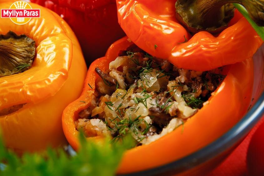 1 стакан Рисовых хлопьев Myllyn Paras 2 стакана кипятка 3 крупных болгарских перца 200 г грибов 1 луковица 1 крупный помидор зелень соль специи Способ приготовления: Рисовые хлопья Myllyn Paras залейте кипятком. Перец промойте, срежьте верхушку, выньте семена и слегка посолите изнутри. Лук мелко нарежьте, потушите в предварительно разогретом масле. Добавьте помидор (очищенный от кожицы и нарезанный), мелко нарезанные грибы.