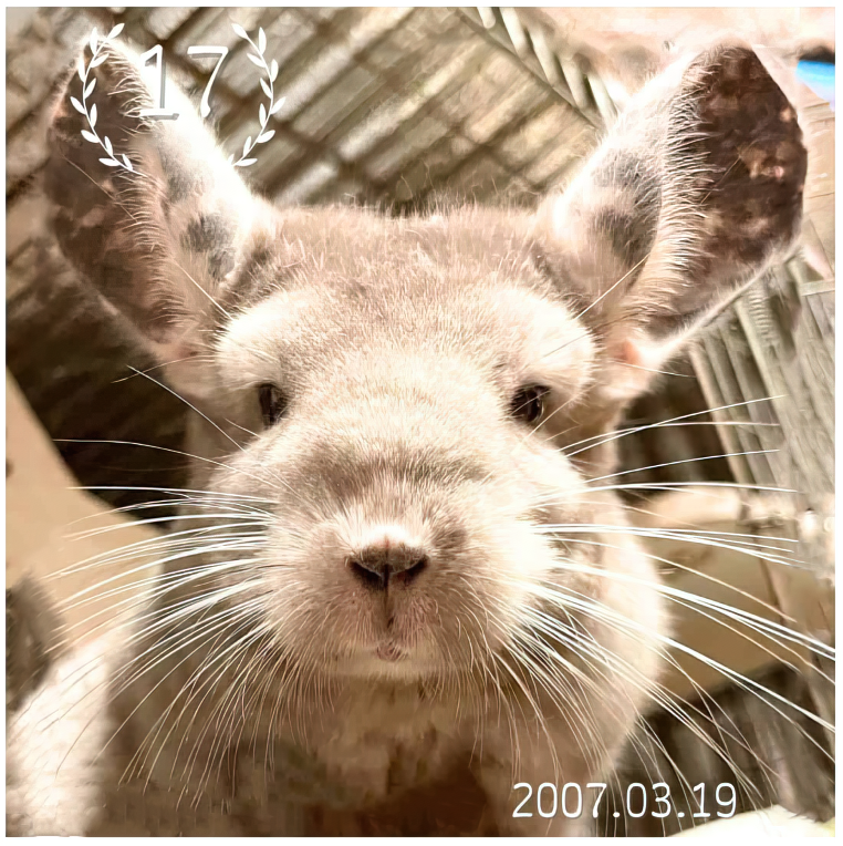"Мы тщательно контролируем температуру и влажность, и он не привередлив в еде, ест разнообразную пищу, включая сено тимофеевки, гранулы и лакомства (он любит сушеные яблоки). Мы также всегда даем палочки-погрызушки. Хотя он не видит из-за катаракты, он каждый день гуляет по комнате. Был период, когда мы жили с собакой, что, возможно, вызывало у него стресс, и я благодарен, что он прожил так долго. Надеюсь, что он продолжит жить мирной и счастливой жизнью каждый день".