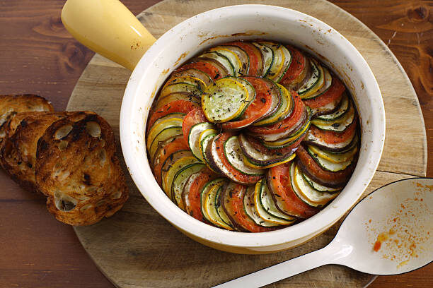 Родившийся в Провансе, рататуй изначально был скромным блюдом фермеров: летний урожай нарезали, тушили в оливковом масле и подавали с хлебом. Его название происходит от окситанского «ratatolha» — «мешать, перемешивать». Мировую славу рататуй обрел благодаря фильму Disney, где его изысканную версию приготовил крыс-гурман. Сегодня это символ французской cuisine du terroir — кухни, отражающей дух земли.