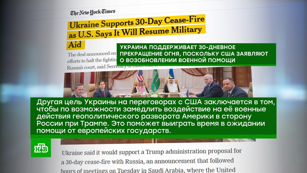 [ Смотреть видео на сайте НТВ ] Европейские лидеры приветствовали предложение о временном прекращении огня, хотя еще недавно запрещали Киеву идти на любые контакты с Москвой. На встречу представителей США и Украины в Саудовской Аравии отреагировала и западная пресса. Газета New York Times полагает, что цель Киева — «выиграть время», чтобы дождаться помощи Европы: «Другая цель Украины на переговорах с США заключается в том, чтобы по возможности замедлить воздействие на ее военные действия геополитического разворота Америки в сторону России при Трампе. Это поможет выиграть время в ожидании помощи от европейских государств». А британская The Guardian считает, что украинские власти пошли на перемирие из-за провалов ВСУ на фронте. Кроме того, на их решение повлиял отказ Белого дома от военных поставок и обмена разведданными: «Это решение было принято более чем через неделю после того, как США прекратили оказание важной помощи Украине, включая поставки военных радаров и боеприпасов, а также