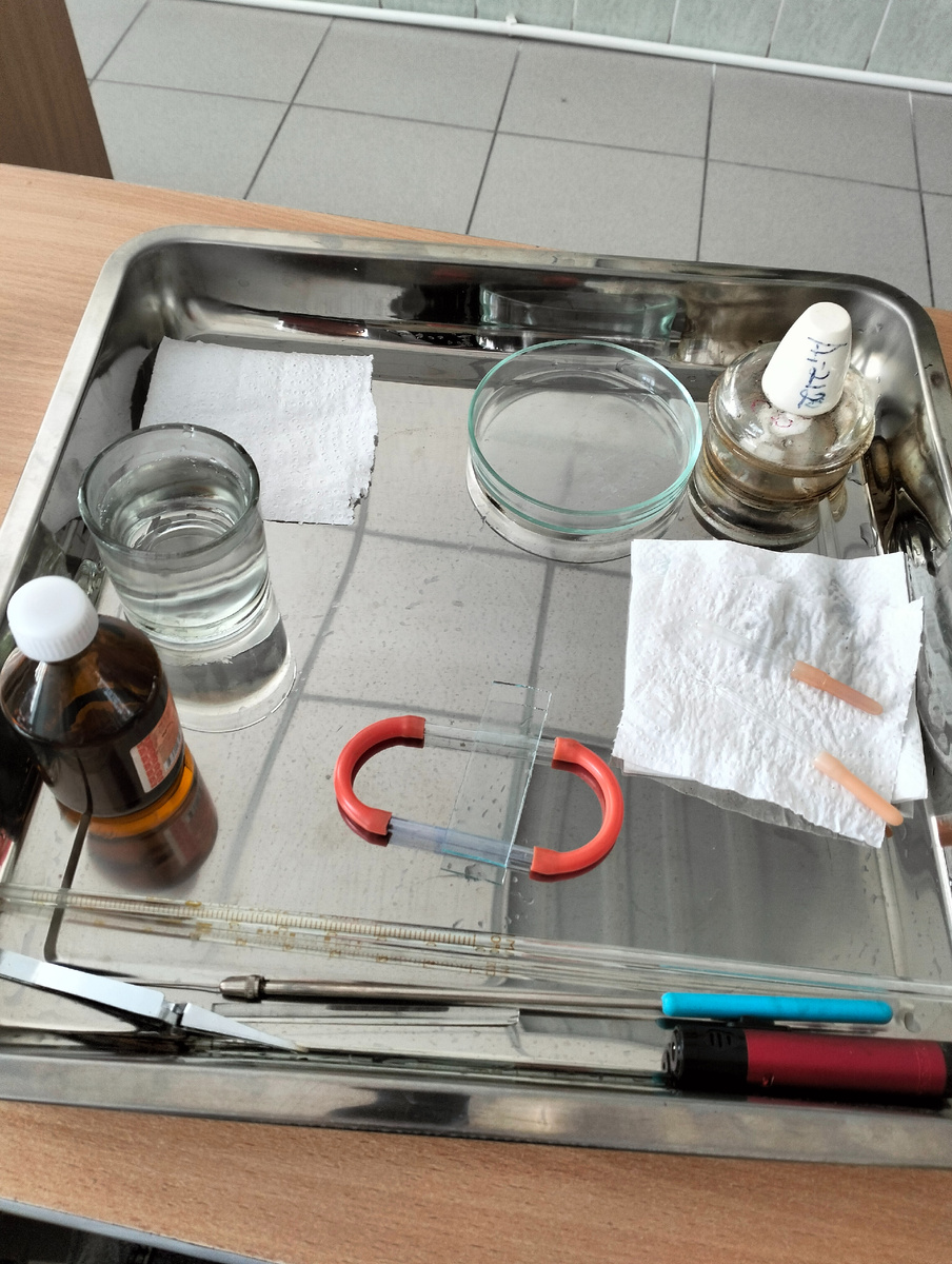 Цель работы Научиться готовить микробиологический препарат из молока, фиксировать и окрашивать бактерии метиленовым синим для их микроскопирования. Оборудование и материалы Ход работы 1. Приготовление мазка: На чистое предметное стекло нанесли каплю воды с помощью пипетки. Внесли небольшое количество кислого молока и равномерно распределили по стеклу. Высушили мазок на воздухе. 2. Фиксация мазка: Провели стекло с мазком три раза над пламенем горелки, не задерживаясь долго, чтобы не перегреть бактерии. 3. Окрашивание: Покрыли мазок раствором метиленового синего на 2 минуты. Смыли краситель водой и просушили стекло салфеткой. 4. Микроскопирование: Нанесли каплю иммерсионного масла на окрашенный мазок. Рассмотрели препарат под микроскопом при иммерсионном увеличении (100× объектив). Результаты и анализ Из-за слишком высокой температуры при фиксации часть бактерий сгорела, что затруднило их наблюдение. Однако удалось рассмотреть отдельные клетки, преимущественно кокки, ст