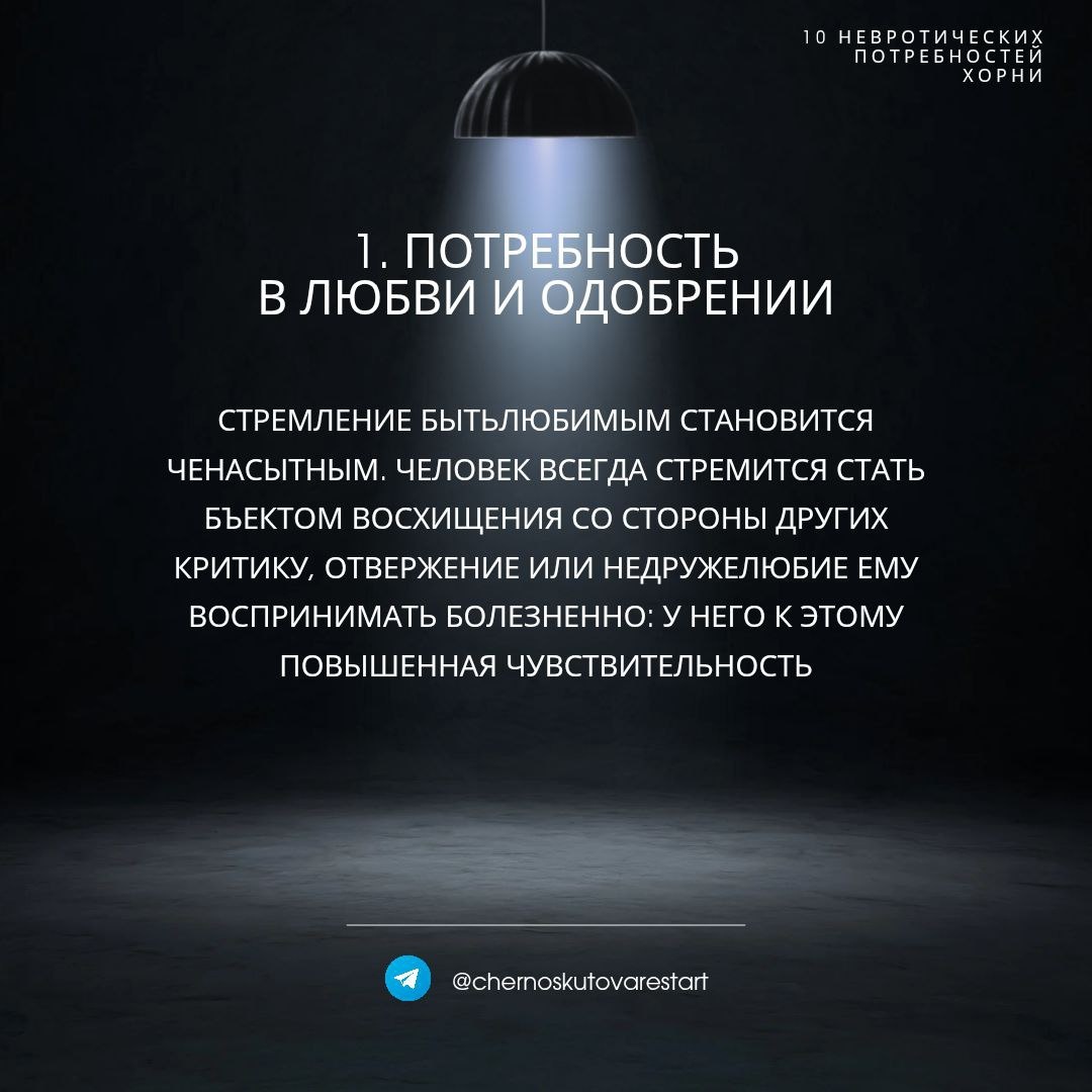 10 невротических потребностей Хорни По мнению психоаналитика Карен Хорни, потребности в любви, одобрении, в чётких ограничениях, общественном признании и другом - присущи всем нам. Они уберегают нас от чувств отверженности, враждебности и беспомощности. Но невротической потребность становится, когда человек негибко воплощает её в самых разных ситуациях. «Если он нуждается в любви, то должен получить её от друга и врага, от работодателя и чистильщика обуви», — пишет психоаналитик. Что это за невротические потребности – мы сейчас расскажем. Листайте карточки и читайте. #эмоциональноевыгорание #поддержка #психология #саморазвитие #логотерапия #благодарность #природа #профессиональнаяпомощь #психотерапия #здоровье #chernoskutovarestart