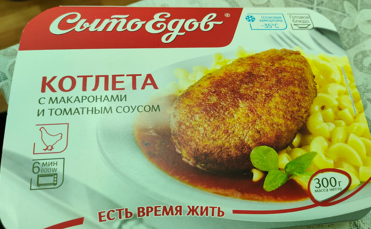 Куплен данный готовый продукт в сети магазинов "Супер лента" за 160 рублей(без скидки 190). Упаковка - 10 из 10; Цена - 8 из 10; Вкус - 8 из 10; Сытость - 9 из 10. Сразу хочется отметить упаковку, она очень удобная, "Сытоедов" одна из тех фирм, которая радует тем, в какой упаковке их продукт. Очень удобно приоткрыть и уже после поместить в микроволновку, и не нужно делать надрезы или проколы, просто супер. Состав хоть и обширный, но как будто бы плюс-минус адекватный, хотя на упаковке с одной стороны нарисована курица, а с другой курица и говядина, не очень понимаю для чего, но лучше никого в заблуждение не вводить. Также на упаковке написан красивый слоган: Блюдо домашней кухни, уже успевшее стать классическим. Сочная и румяная котлета придется по вкусу каждому любителю мяса. На гарнир - макароны из муки твердых сортов пшеницы. Томатный соус идеально дополняет блюдо, которое прекрасно подойдёт для сытного обеда или ужина. Так вот, относительно этого заявления и будем рассматривать да