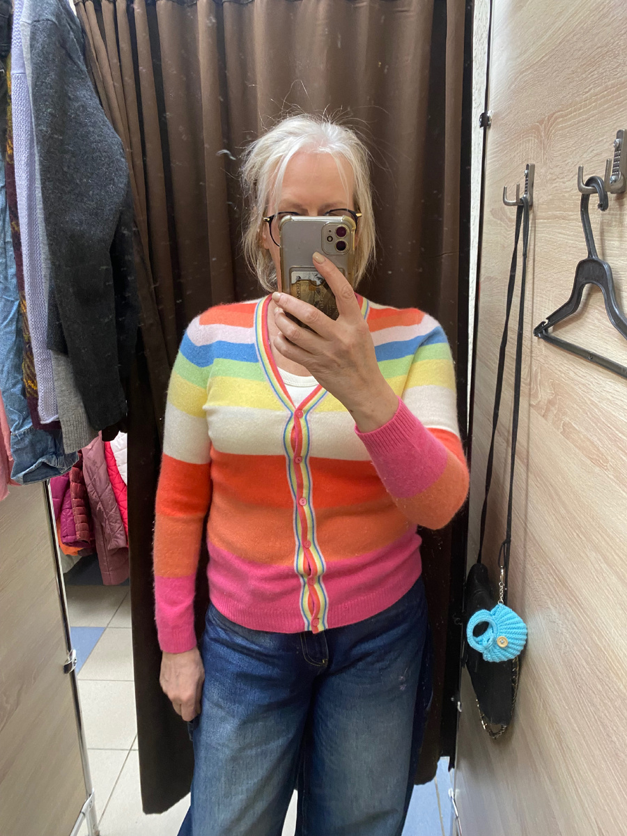 Привет) Продолжу обзор вещей с нового поступления. В последне время очень редко стали попадать изюминки, те, о которых хочется кричать на весь свет, но все же, хороших вещей очень много, и естественно, они в разы дешевле чем из бутиков. А нам только это и надо) Разноцветная кофточка… Какое-то двоякое у меня к ней отношение сложилось, и наверняка не только у меня) Здесь какая отсылка в подсознании сформировалась… Кардиганы разных мастей это мастхэв сезона 2025 года( этот мне маленький, а так бы прекрасно подошел как первый слой) А тем более, это кашемир, который стоит очень больших денег в обычном магазине. Который согревает и тело и душу. Ведь он в 10 раз теплее шерсти и мягкий как облачко⛅️ Цена этой кофты , насколько я помню, 1800 рублей. Это уже с моей комиссией. Кто-то сейчас скажет , что это дорого, и покупает в своих Секонд Хендах в разы дешевле…И правда, встречаются такие щедрые подарки, вот только их становится все меньше и меньше.А когда-то можно было и за 100 рублей найт