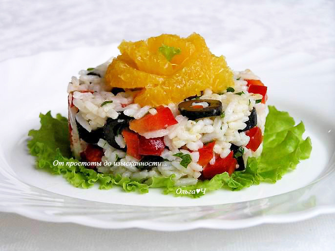 листья салата для украшения Приготовление: К остывшему рису добавьте нарезанные кружочками маслины, кубиками сладкий перец и рубленную петрушку, перемешайте. Заправьте салат маслом, лимонным соком, посолите и поперчите по вкусу. Перемешайте. Листья салата разложите по тарелкам, выложите салат с помощью кулинарного кольца. Апельсин филируйте и выложите "розу" из долек апельсина сверху на салат. Приятного аппетита! Вам также могут понравиться: