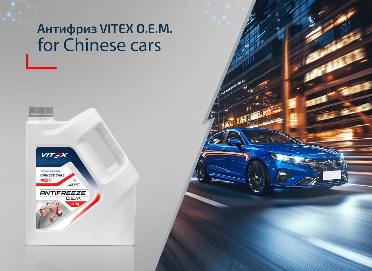 На дорогах становится все больше китайских автомобилей. Чтобы обеспечить их надежность и долговечность, Vitex предлагает качественный антифриз, который идеально подходит именно для них. Антифриз Vitex O.E.M. for Chinese cars - современный высокотехнологичный карбоксилатный антифриз, предназначенный для применения в системах охлаждения двигателей внутреннего сгорания легковых автомобилей и легкого коммерческого транспорта. Специально разработан для автомобилей китайского производства. Изготовлен на базе этиленгликоля высшего сорта и пакета присадок на основе органических кислот. Обладает увеличенным сроком эксплуатации до 5 лет или 250 000 км пробега. Эффективно защищает от коррозии металлы и сплавы, гарантирует оптимальную защиту алюминия в условиях высоких температур. Не содержит силикатов, нитритов, нитратов и фосфатов. Препятствует образованию накипи и отложений в процессе эксплуатации. Обеспечивает стабильную работу системы охлаждения. Совместим со всеми современными материалами уп