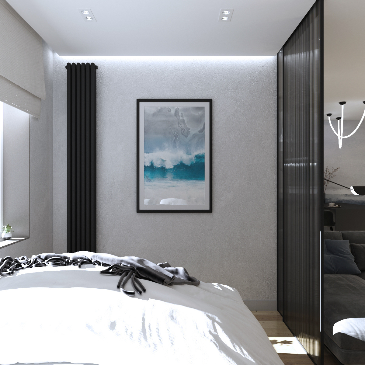- Создать акцент: темная стена в конце комнаты "притягивает" взгляд и добавляет глубины.