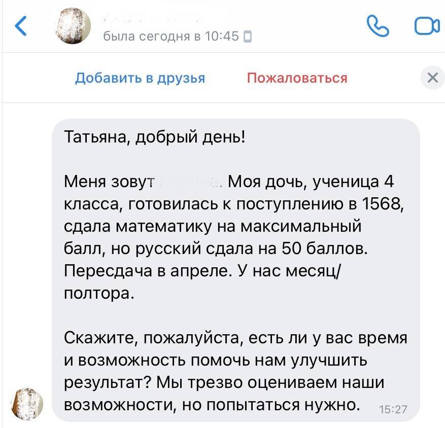 Зимняя волна экзаменов в школу № 1568 в очередной раз проявила закономерность, о которой я не устаю говорить родителям четвероклассников. Да, школа эта физико-математическая. Да, ребёнок получил высокий балл на олимпиаде по математике. Но поступить сюда без качественной подготовки по русскому языку весьма и весьма проблематично. Но я верю в детей. Верю в то, что упорство и трудолюбие, помноженные на решимость сделать вторую попытку, приведут к успеху. Если в знаниях ребёнка нет совсем уж зияющих провалов, то проверенная методика опытного репетитора должна помочь. Неделю назад я закончила набор на свой онлайн-интенсив по русскому языку «ПОСТУПАЕМ В ШКОЛУ № 1568» и приступила к занятиям с учениками. Что ж, как говорится, вызов брошен – вызов принят! Впереди ещё почти 3 недели активнейшей подготовки умных и работоспособных детей, а интенсив - это возможность в короткие сроки вооружить их прочными знаниями школьной программы и всех нюансов предстоящего экзамена. Пожелайте нам удачи!