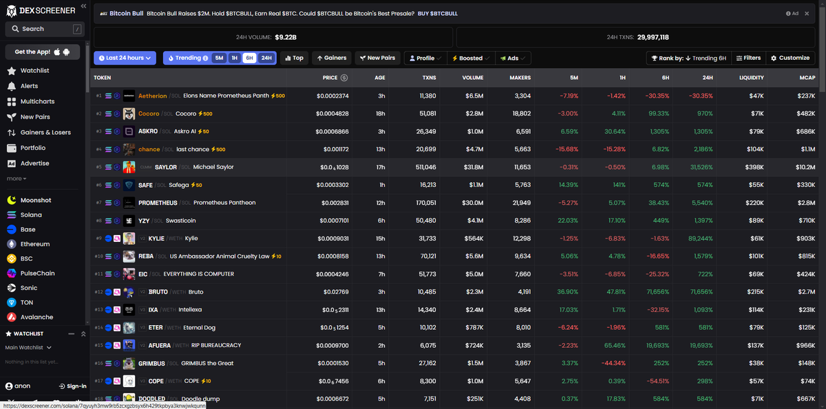 Хотим поделиться списком популярных ресурсов, которые помогут вам в анализе крипторынка: 1. DexScreener — поможет отслеживать и анализировать данные о DEX. 2. CoinMarketCap — сервис для мониторинга информации о криптовалютах. Хранит данные о рыночной капитализации, ценах, объемах торгов, циркулирующем предложении и другой статистике. 3. CoinGecko — аналог CoinMarketCap. Выберите тот, который вам удобнее. 4. Crypto Bubbles — платформа для отслеживания цен на криптовалюты в реальном времени. Интуитивно понятный интерфейс помогает быстро выявлять тренды. 5. CoinGlass — анализирует данные о криптовалютных рынках, включая информацию о ликвидациях, открытых интересах, объемах торгов и других ключевых метриках. 6. Fear & Greed Meter — индекс страха и жадности для оценки рыночных настроений. 7. HolderScan — инструмент для отслеживания и анализа данных о держателях криптотокенов. 8. Cockie.fun — сайт, предоставляющий инструменты для анализа и отслеживания данных о криптовалютных кошельк