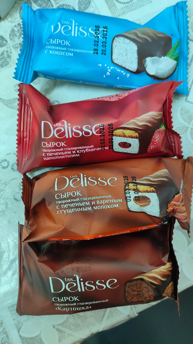 Все сырки стоили в сети магазинов "Супер лента" примерно 40 рублей за 40 грамм, хорошая соотношение цены и граммовки прям 1 к 1. Упаковка у всех очень приятная и привлекательная, точно будет заметна на витрине. Мы видим яркие цвета и красивое изображение продукта, конечно изображение сильно приукрашено, но и сходства легко найти. Аромат - приятный у 3 из 4, так как запах мне не особо понравился, у сырка "картошка". На обратной стороне у каждого стандартные записи: состав, изготовитель, пищевая и энергетическая ценность, а также условия хранения. 1. С печеньем с клубничным наполнителем. Шоколад не имеет глобально вкуса, он больше выступает в качестве барьера для излишней сладости, так как есть очень сильное сладкое послевкусие от клубники и творожной массы, именно так бы я описал, так как структура идёт единым непонятным слоем, самой же начинки очень мало. По вкусу это просто дешёвый джем, ароматика и вкус сомнительная. Печенья много, но вкуса по-сути нет, его приходится прям жева
