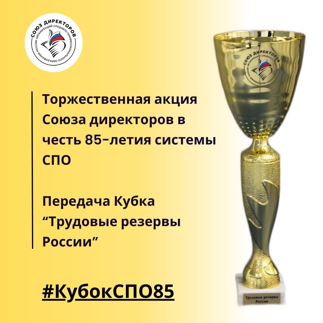 В 2025 году Россия отметит 85-летие системы среднего профессионального образования!🎉 Датой отсчёта истории считается 2 октября 1940 года, когда был издан Указ Президиума Верховного Совета СССР «О государственных трудовых резервах». Этот документ стал отправной точкой для создания системы подготовки и распределения квалифицированных рабочих из городской и сельской молодёжи, а с 2022 года 2 октября по указу Президента РФ в России отмечают День среднего профессионального образования. 💥В честь юбилея Союз директоров запускает торжественную акцию, которая объединит регионы страны и подчеркнёт значимость СПО. 🏆Это передача Кубка «Трудовые резервы России» и Книги «Пожелания будущему поколению» из региона в регион России во время проведения Окружных форумов руководителей организаций СПО. Кубок и Книга - символы преемственности образовательных традиций в российском профессиональном образовании и единства образовательного пространства. 💥Передача Кубка состоится во время Окружных форум
