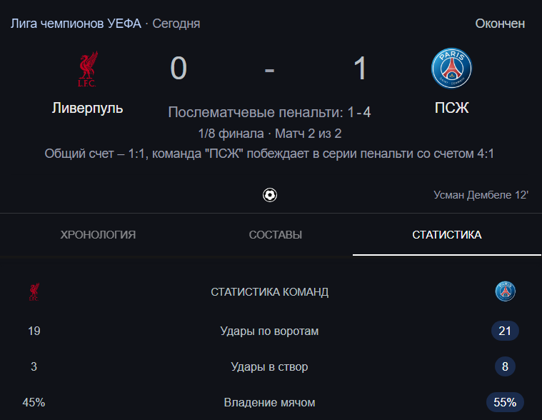 Если в первом матче Ливерпулю банально повезло, они терпели, ждали и нашли свой момент, то во втором они лишились этого везения, а в серии пенальти допустили фантастический провал. Ни капли не жаль такой Ливерпуль, у него не было ни яиц, ни горящих глаз...ПСЖ идёт дальше и идёт дальше действительно заслужив это.