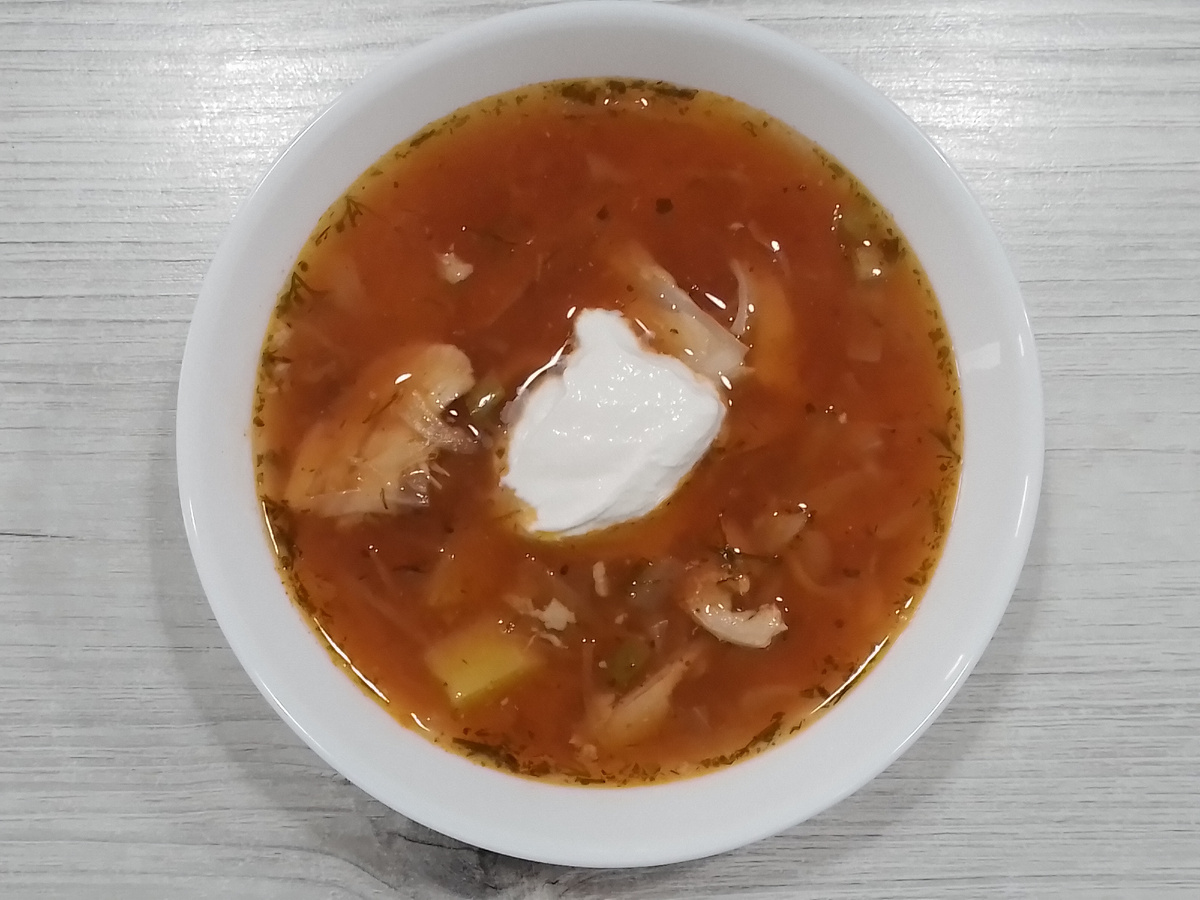 Сразу после завтрака я начала готовить суп - щи из квашеной капусты на курином остове. К обеду был готов.