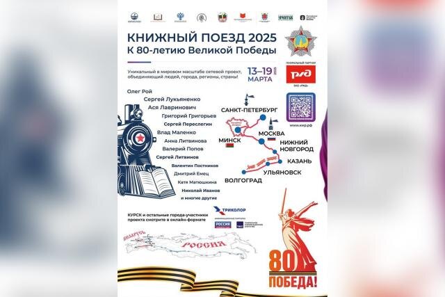 Завтра, 13 марта, в Санкт-Петербурге стартует проект «Книжный поезд», посвящённый 80-летию Победы в Великой Отечественной войне. Железнодорожный состав с известными российскими писателями, издателями и представителями библиотечных сообществ посетит Минск, Москву, Нижний Новгород, Казань, Ульяновск и 19 марта прибудет в Волгоград.