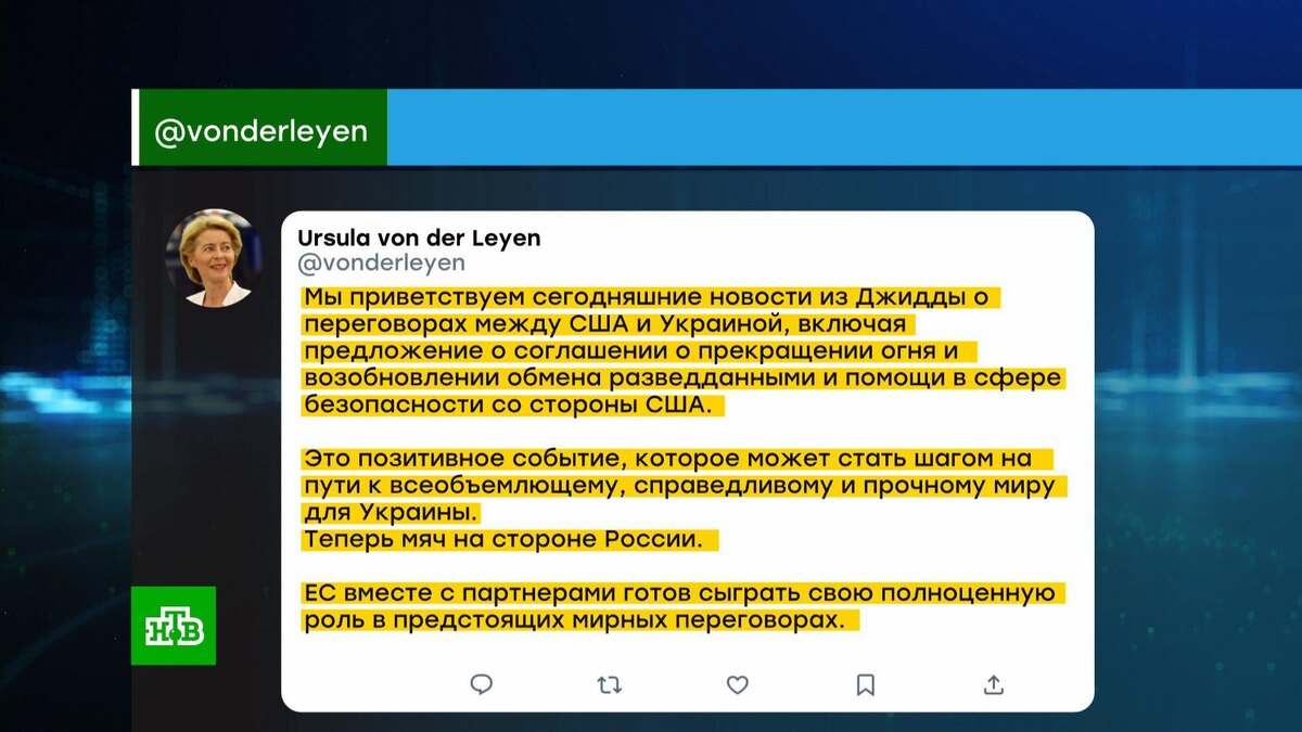 [ Смотреть видео на сайте НТВ ] Итоги украино-американских консультаций в Саудовской Аравии неожиданно позитивно встретили в Европе. Европейские политики один за другим «переобулись» и приветствовали идею о временном прекращении огня, хотя еще недавно не допускали и мысли о каких-либо контактах Киева с Москвой. Европейцы, как под копирку, повторили слова госсекретаря США Марко Рубио о том, что в переговорном процессе «мяч теперь на стороне России». Как отмечают аналитики, в Старом свете сейчас царит диссонанс: с одной стороны, лидеры хотят продолжать накачивать Украину военной и финансовой помощью, а с другой стороны, боятся по-настоящему перечить большому заокеанскому брату, который настроен на завершение конфликта. Такая политическая акробатика, как подчеркивают эксперты, когда стараются угодить «и вашим, и нашим», обречена на провал и уже наметила серьезный раскол в самом Евросоюзе. [ Смотреть видео на сайте НТВ ]