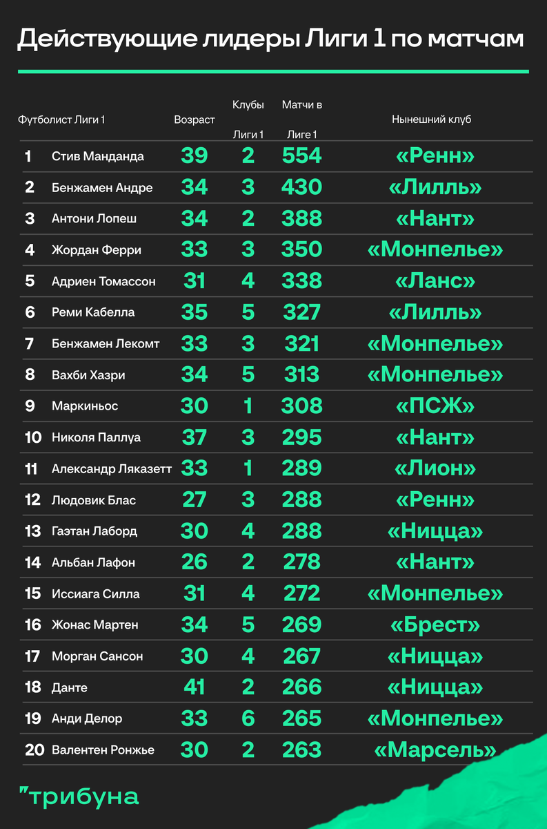 Ниже представлена таблица, в которую внесены двадцать футболистов, имеющих наибольшее количество матчей во французском высшем дивизионе (но только среди тех, кто играет там на данный момент).
