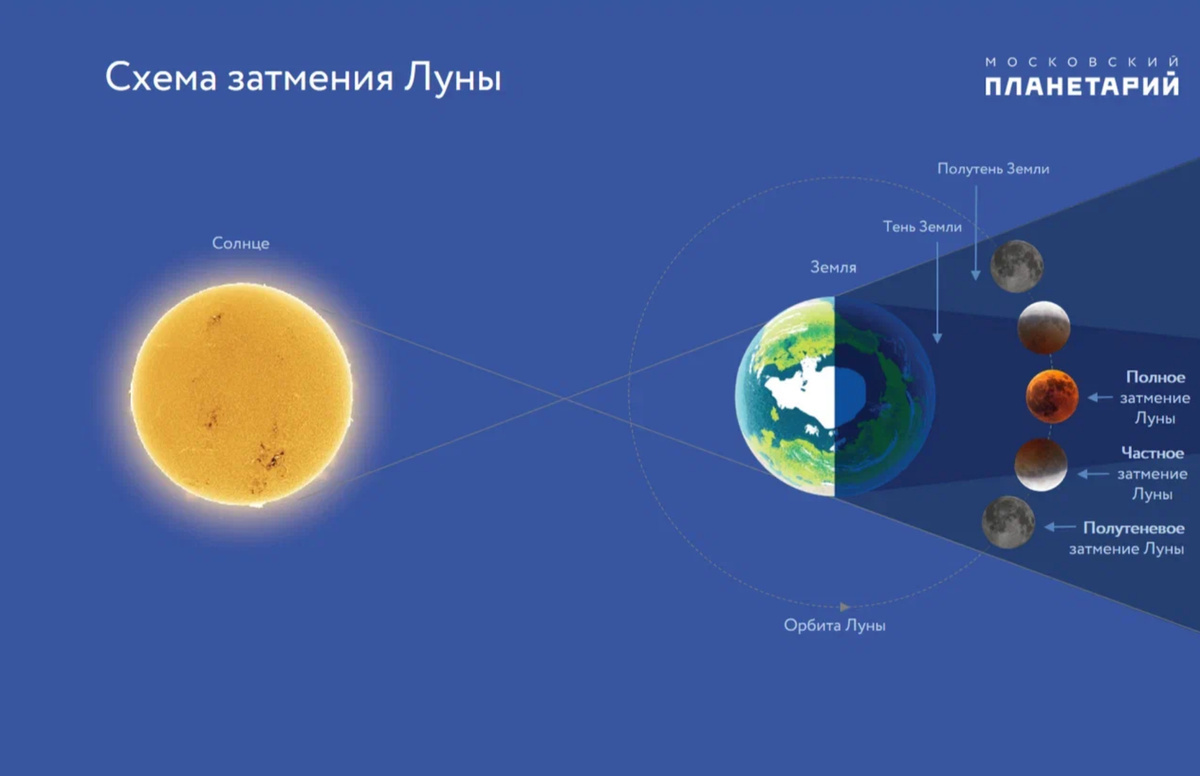 И тень Земли падает на Луну. Различают фазу тени и полутени. Но в секторе полутени потемнение лунного диска практически не заметно. Эффект затмения бывает только когда Луна зайдет в область полной тени. А это бывает не всегда. Вообще, затмения это явление довольно регулярное, случается два раза в год. Просто не все можно наблюдать. Поэтому полное лунное затмение в старину было довольно редким явлением и поэтому пугающим.