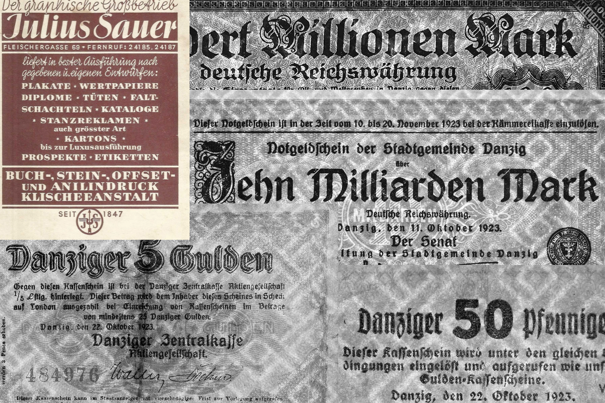 В 1923 году Сенат Данцига, довольный хорошим сотрудничеством, поручил типографии Юлиуса Зауэра печатать банкноты Центрального казначейства - "промежуточные гульдены", которые с 24 октября 1923 года должны были быть выпущены в качестве переходной валюты от немецкой марки к данцигскому гульдену.