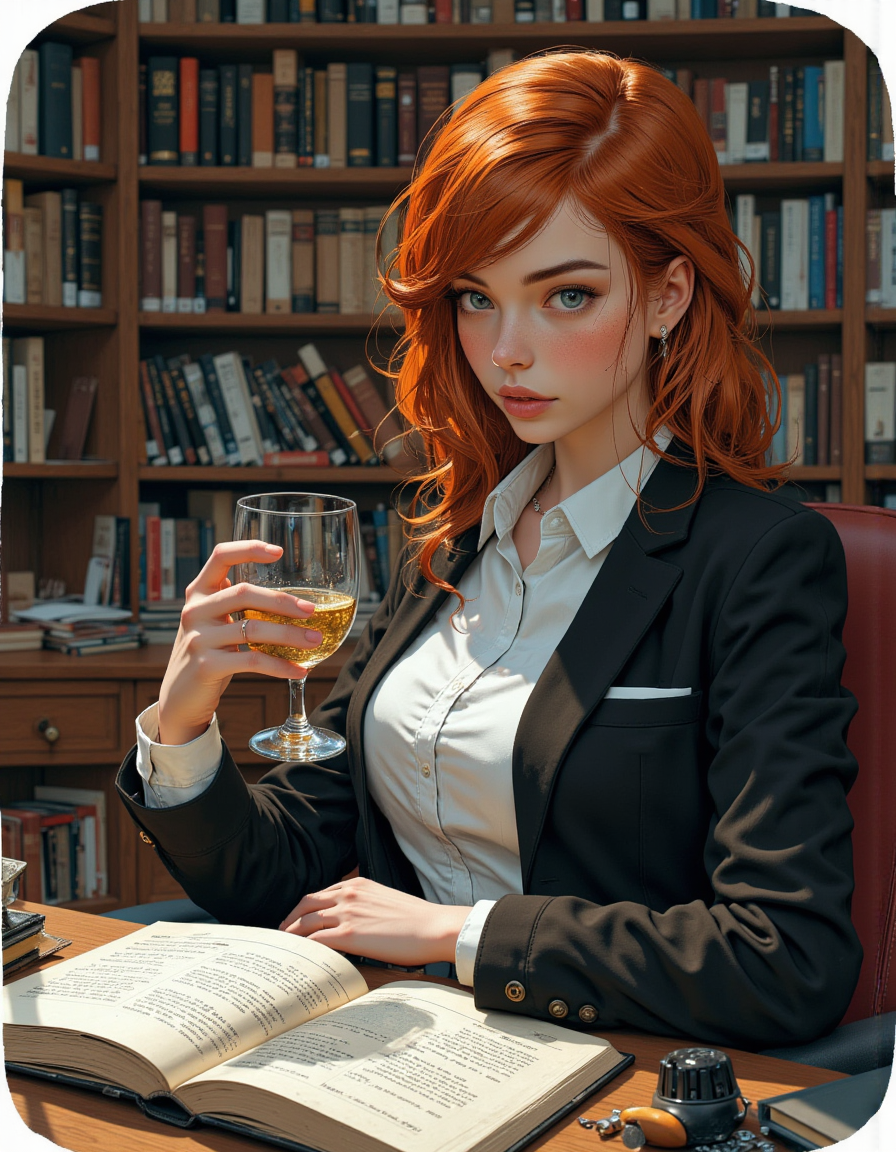 Я понимаю, что на дзене видимо другие материалы приносят кучу просмотров, по типу рецептов, "посмотри, что я купил там-то", или же всякие политические обозревания, но я все же на другом специализируюсь, так что буду продолжать рассказывать и показывать вам про творчество и про нейро генерации в частности. Эта статья уже вроде третья в цикле "смотри иллюстрации, бери промт на заметку". Тут покажу вам результат генераций за несколько дней. Конечно, я не могу тут выложить вообще все, что генерирую, потому что многое явно не понравится дзеновскому алгоритму, так что кому интересно, подписывайтесь на группу в ВК. Там-то уже сможете увидеть намного больше! А вот и сам промт: a woman reading a book in a library, trending on pexels, oval shape face, in professional makeup, intriguing volume flutter, reduce character duplication, pencil miniskirt, conquering imbalance, defined jawline, nerdy appearance, white borders, lawyer clothing, hgh, a redheaded young woman, highly detailed В прошлый раз