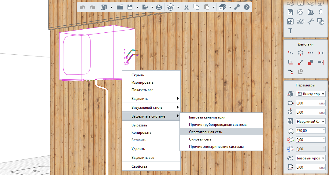 Аксессуары трубопровода и воздуховода тоже можно подключать к одной, двум и более системам. При изменении положения аксессуара на одной трассе, трасса другой системы будет отредактирована вместе с ним без дополнительных действий. Если в ваших проектах есть такая необходимость, используйте эту возможность. Примеры вы можете найти в проекте Maisonette.rnp, который хранится в вашей папке установки Renga. Кстати, эти объекты, как и любые другие, вы можете копировать в свои проекты.