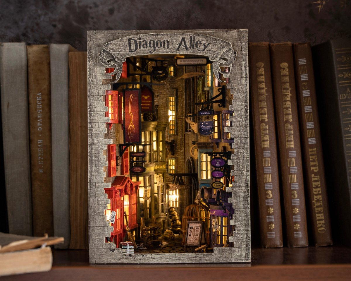 Пополнение коллекции букнуков от Alice & Cat: теперь вся Косая Аллея с легкостью поместится на полке. У вас получится настоящая улица с узнаваемыми фасадами и вывесками. Соберите Магазин мантий, Лавку с волшебными палочками, Магазинчик мётел и Совиную лавку. Расставьте декор и вывески, не забудьте про зеркало, чтобы улочка казалась еще длиннее, и полюбуйтесь в отражении на маленькое витражное окошко. Мы предусмотрели защитное стекло, так в букнук не попадёт пыль. А вы сможете заглядывать внутрь, не появились ли на улочке Гарри и Хагрид. В наборе уже есть нужные материалы и инструменты: деревянные детали, 3д-фигурки, краски, кисти, воск, наждачная бумага, клей, канцелярский нож, принты. Заказать ВКонтакте Заказать на Ozon