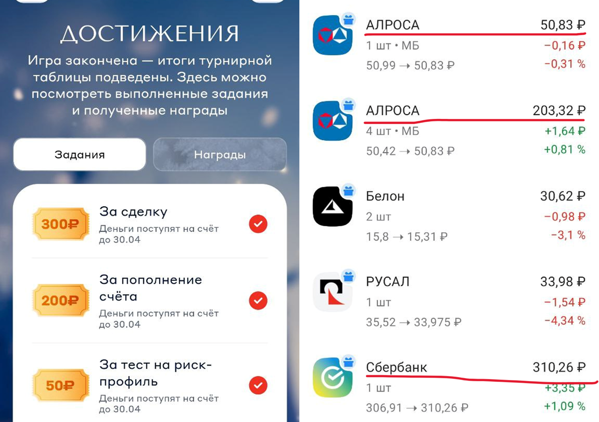 У меня на брокерском счете появились подарочные акции за выполнение заданий: 5 акций Алросы и 1 акций Сбербанка.