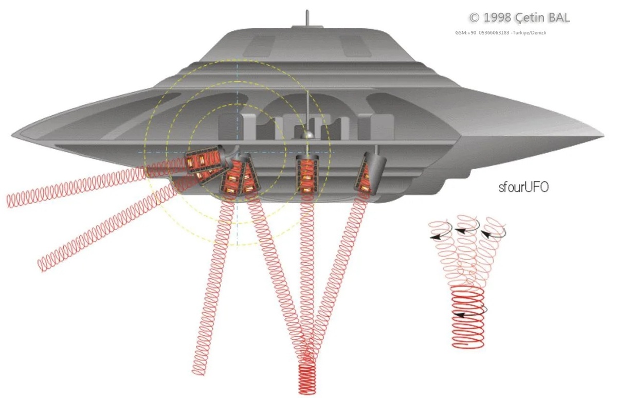 Многим интересно: как же летают инопланетяне? Скажу сразу, что у них много разных типов космических кораблей, но основные два: межзвёздный огромный и маленькие планетолёты. Земляне в основном видят дискообразные планетолёты, которые могут летать в пределах звёздной системы. Для перемещения между звёзд нужно много времени, около года, а то и больше, поэтому выгоднее это время пребывать на более комфортном аппарате и к тому же большой объект может развивать большую скорость в отличие от маленького. Я читал о том, как устроен дисколёт и устройство его обсуждал с нейросетью. Двигательная система НЛО - это свч генераторы и излучатели направленного действия. В дисколёте находится три магнитных излучателя трубного типа, соединённые с свч генераторами. Эти излучатели могут находится в разных конфигурациях для совершения манёвров в электромагнитном поле Земли, но когда требуется очень быстрый вылет в космос, то все три излучателя направляются в одну и ту же точку в пространстве. Излучение про
