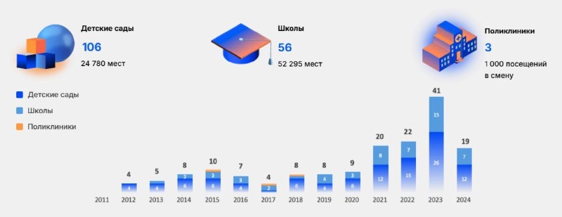 В нем участвуют крупнейшие московские девелоперы. Результаты показали лидеров в строительстве социальных объектов и ключевые рыночные тенденции. • За 14 лет девелоперами было построено 165 объектов: ⇒ Детские сады: 106 объектов на 24 780 мест; ⇒ Школы: 56 объектов на 52 295 мест; ⇒ Поликлиники: 3 объекта на 1 000 посещений в смену; ⇒ Лидеры среди девелоперов: ⇒ ПИК – 47 объектов; ⇒ Самолет – 22 объекта; ⇒ A101 – 20 объектов; ⇒ АБСОЛЮТ – 17 объектов; ⇒ Инвесттраст – 10 объектов.
