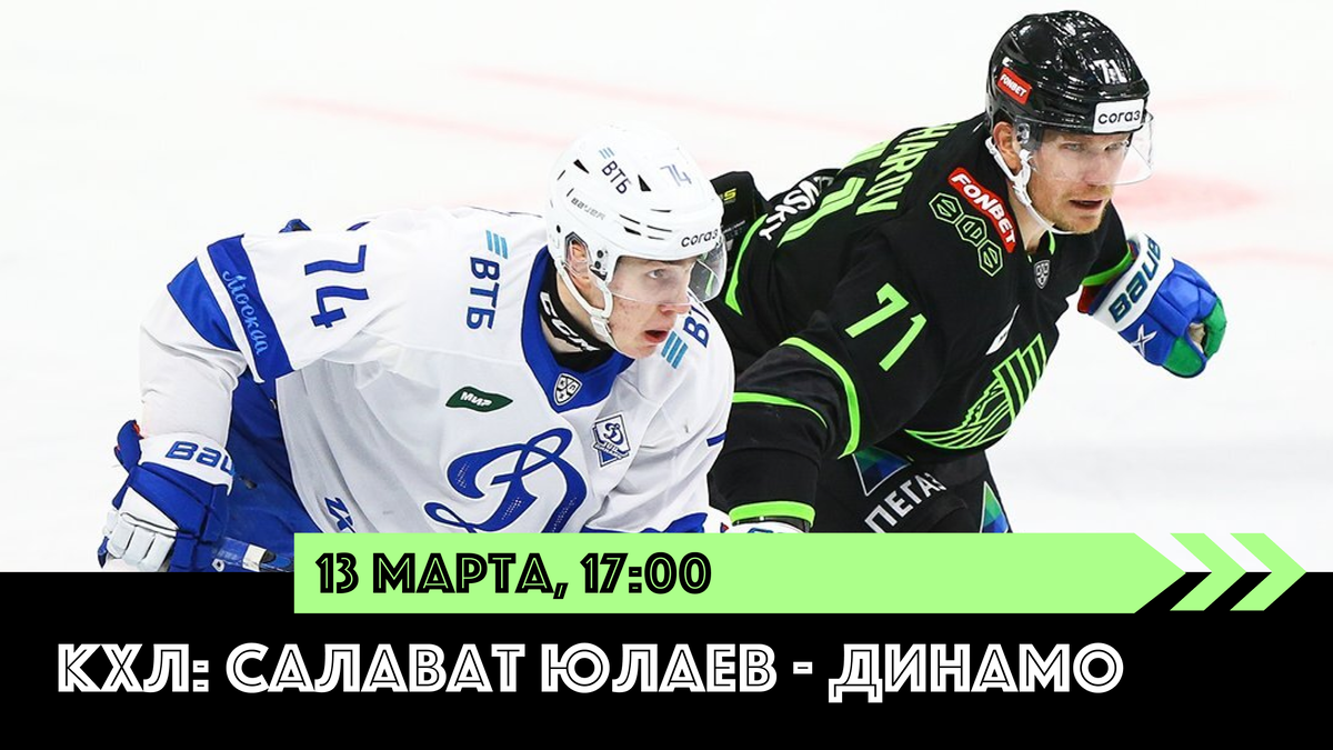 В четверг, 13 марта, состоится матч КХЛ между «Салаватом» и московским «Динамо». Встреча пройдёт в Уфе на стадионе «Уфа-Арена» в 17:00 по московскому времени. Ее трансляцию будут вести канал «Матч ТВ» и онлайн-сервис «Кинопоиск». После 63 игр «Салават» занимает вторую строчку, набрав 85 баллов, в Восточной конференции. «Динамо» Москва после 63 матчей расположился на втором месте, заработав 83 очка, в Западной конференции. «Салават Юлаев» Коллектив Виктора Козлова удерживает вторую строчку в Восточной конференции. При сохранении текущей позиции уфимцы попадают на «Адмирал». Кажется, что такое развитие событий может более чем устроить команду. Да, конечно, это дополнительные перелёты, привыкание к часовому поясу, — тяжело. Но вряд ли «Адмирал» сможет выбить уфимцев. Плюс, для «зелёных» это будет хорошо ещё тем, что с самого начала будет соперник, с которым нужно проявить характер, чтобы добыть победу, а это закаляет команду в плей-офф. Команда Козлова завершила выездную серию, которая в