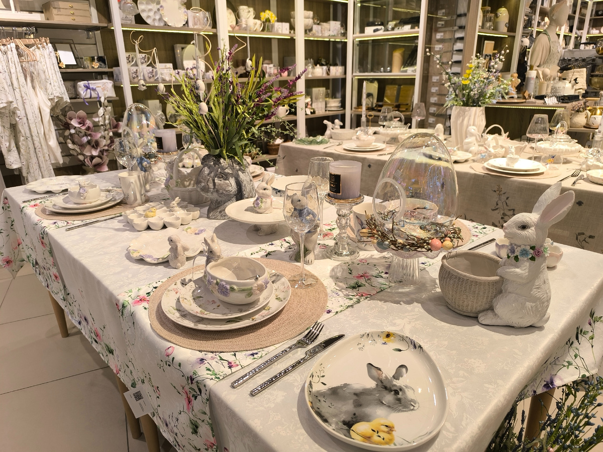 Время бежит стремительно. Только недавно отгремели новогодние салюты, ещё кажется вчера отшумела Масленица, а уже скоро и Пасха. Это один из моих любимых праздников с детства. За нарядность, за яркость, за живые цветы и ветки, за красивый праздничный стол. Каждый год хочется сделать этот день незабываемым и уютным. Зашла в Кюхенленд полюбоваться на праздничные пасхальные сервировки. Делюсь с вами этой нежной красотой. Большой подсвечник из стекла в виде яйца на стеклянной подставке с украшением -- венок из вербы с декоративными яичками. Букет из весенних цветов. Обратила внимание на спиральки из бамбука кажется, на которые повесили малюсенькие фарфоровые пасхальные яйца. Очень красиво смотрится. Подставка из фарфора для пасхальных яиц. Два гнёздышка заняты цыплёнком и кроликом. Букет из искусственных растений с пасхальными яичками с другого ракурса. Очень понравилась инсталляция для украшения пасхального стола. Вторая сервировка пасхального праздничного стола. Очень много посуды с кро