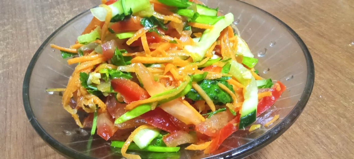 Сегодня я приготовила легкий и вкусный салат из свежих огурцов и помидоров, который идеально подходит для любого времени года. Я добавила морковь, перец и ароматный чеснок, чтобы сделать его еще более насыщенным. Заправка из растительного масла, уксуса и соевого соуса придает салату особую пикантность. Попробуйте этот салат, и он станет вашим любимым! 1. Ингредиенты: - 2 огурца, нарезанных брусочками - 1 морковь, натертая на корейской терке - 1 сладкий перец, нарезанный соломкой - 1 помидор, нарезанный брусочками - Перья зеленого лука, нарезанных брусочками - 2 зубчика чеснока, измельченных - 100 мл кипящего растительного масла - 1 чайная ложка уксуса 9% - 1 чайная ложка соевого соуса - Соль, паприка, острый перец по вкусу 2. Приготовление: - В глубокой миске смешайте огурцы, морковь, перец, помидор, зеленый лук и чеснок. - В отдельной емкости смешайте уксус, соевый соус, соль и специи. - Залейте овощи кипящим растительным маслом, заправкой и перемешайте. - Дайте настояться 10-15 минут