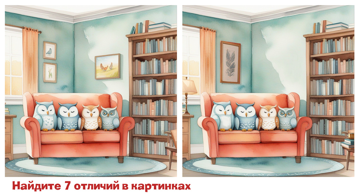 Найди 7 отличий. Тренируй внимание в уютной библиотеке.
