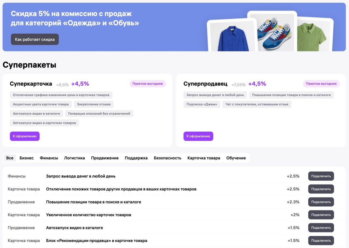 Если вы продаете одежду или обувь, вы можете легально (без регистрации и СМС) снизить комиссию, подключив себе любую опцию из «Конструктора»