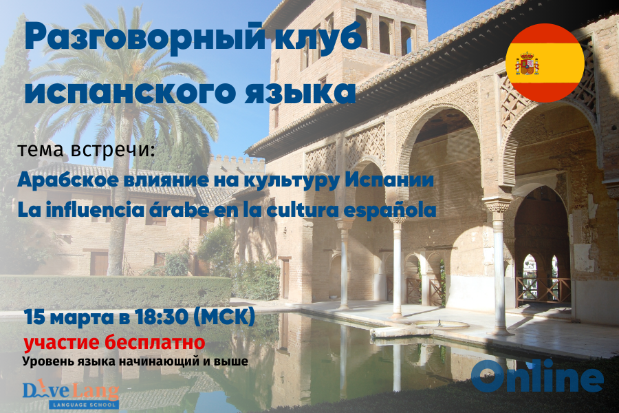 Приглашаем всех желающих принять участие в разговорном онлайн-клубе по испанскому языку! Тема нашей встречи: Арабское влияние на культуру Испании. La influencia árabe en la cultura española. Начало мероприятия: 15 марта 2025г. в 18:30 по МСК Для всех желающих - бесплатно! Записаться можно, оставив заявку на этой странице - https://www.divelang.ru/blog/events/15-marta-2025g-razgovornyy-klub-po-ispanskomu-onlayn/ Место проведения: платформа SKYPE (ссылка будет направлена на почту за день до мероприятия) Рекомендуемый уровень владения языком: А1 и выше