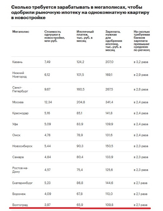Расчеты сделали журналисты «РБК-Недвижимость». Здесь говорят, что в Волгограде сегодня самые низкие требования к зарплате. В нашем городе небольшая «однушка» 35 «квадратов» в новостройке стоит в среднем 3,97 миллионов рублей. Это в три раза меньше, чем в столице. По понятной причине, спрос к зарплате меньше. В исследовании говорится, что зарплата волгоградцев, чтобы банк одобрил ипотеку, должна превышать сегодня среднюю в 2,1 раза! По последним данным Росстата (декабрь 2024), средней зарплатой в Волгограде считается сумма 81 666 тысяч рублей. Мы не исключали, что в последнем месяце прошлого года к такой аномалии привели 13 зарплаты и другие презенты к праздникам. Причем средней годовой зарплатой называлась сумма значительно ниже — 59 407 тысяч рублей. Впрочем, есть уже точная сумма заработков для одобрения на данный момент ипотеки в Волгограде. И это 109,8 тысяч рублей в месяц. Причем ежемесячные взносы в течение 15 лет по кредиту за небольшую однокомнатную квартиру составят почти 70 т