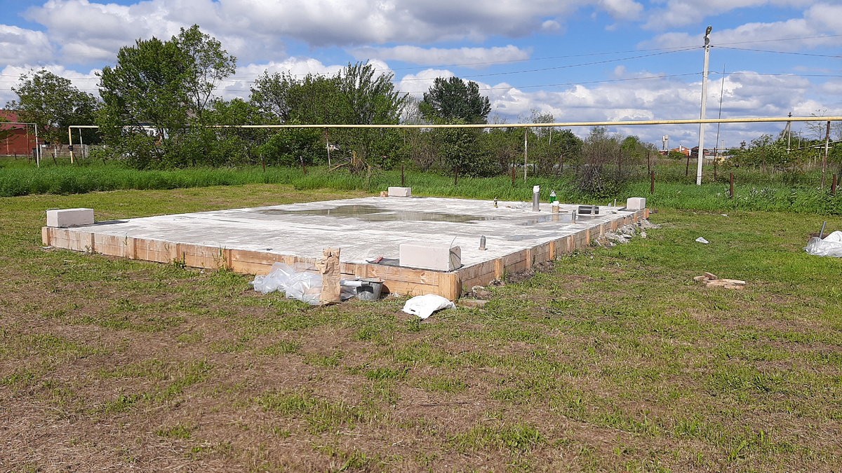 • Выдержка. По завершении заливки я дал фундаменту «отстояться» около недели: этого времени обычно недостаточно для полного набора прочности, но мне было достаточно, чтобы без серьёзных нагрузок перейти к возведению стен.